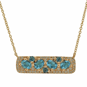 9ct RG London blue, swiss blue topaz and diamond necklace.