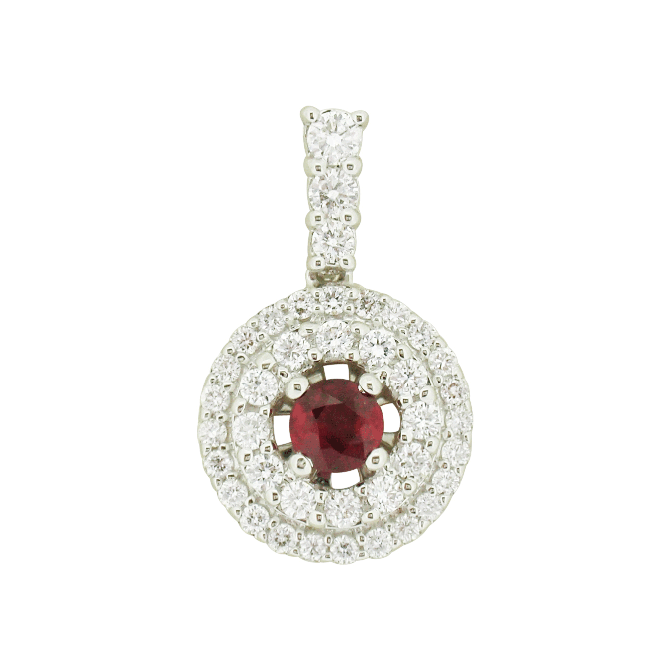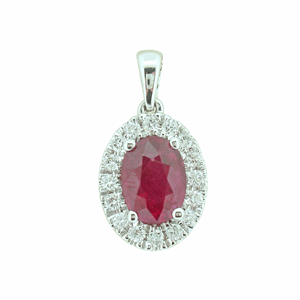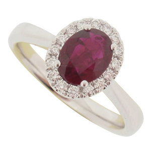 18ct WG ruby and diamond halo cluster ring.