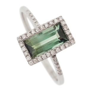 9ct WG sapphire and baguette diamond ring.