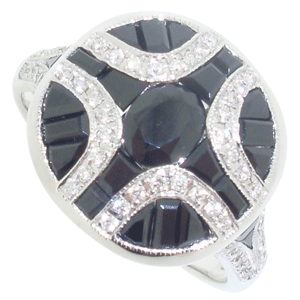 18ct WG black diamond ring with diamonds set half way around the band.